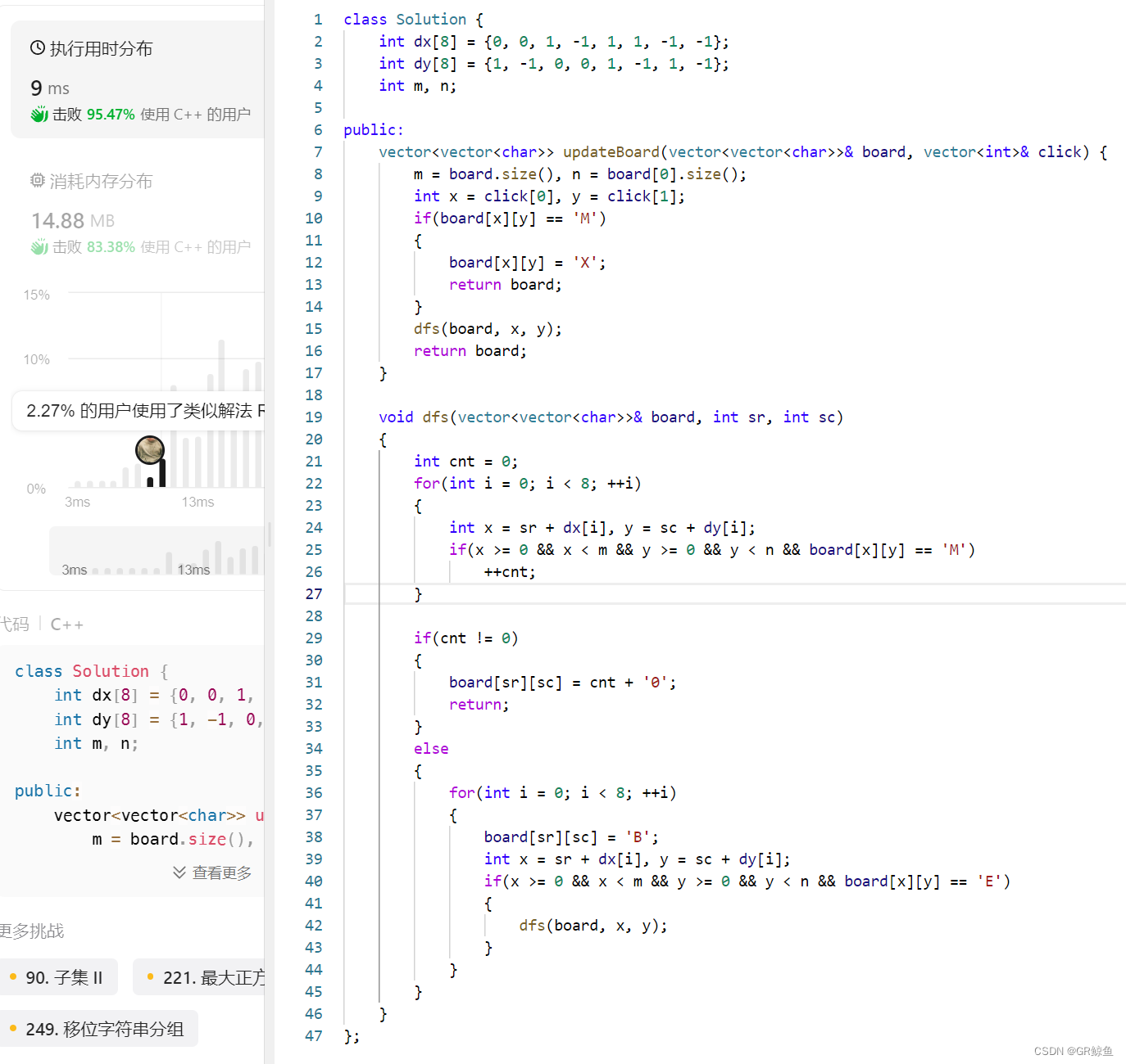 模拟类型的 dfs 题目。首先要搞懂题目要求,也就是游戏规则。从题目所给的点击位置开始,根据游戏规则,来一次 dfs 即可。