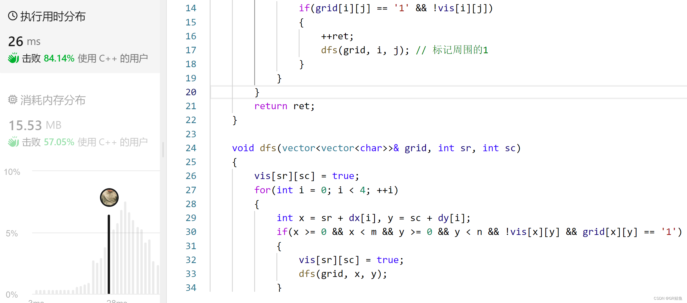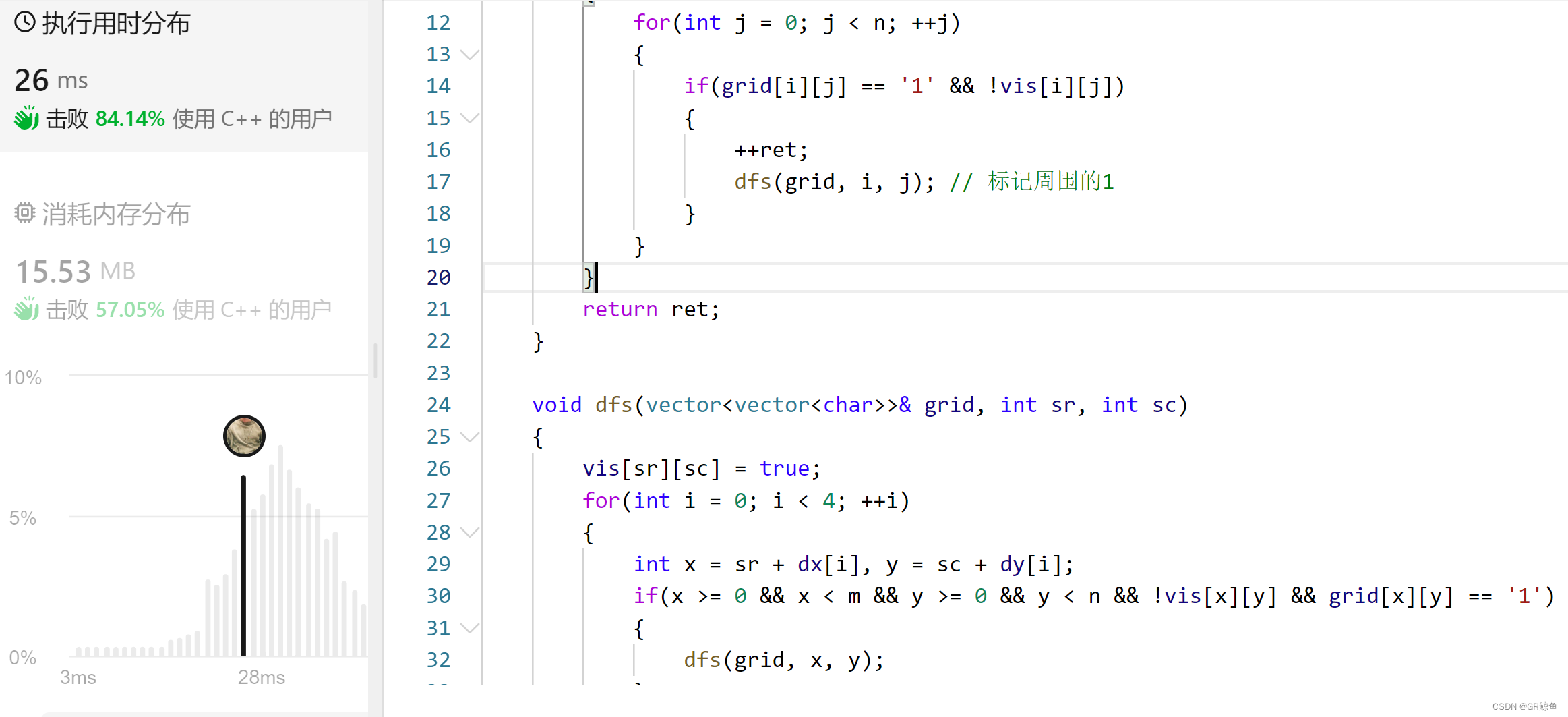 (这里用全局bool数组来判断陆地是否被遍历过,也可以直接修改数组,面试的时候可以问面试官是否可以直接修改数组,现在就建议不修改原数组)