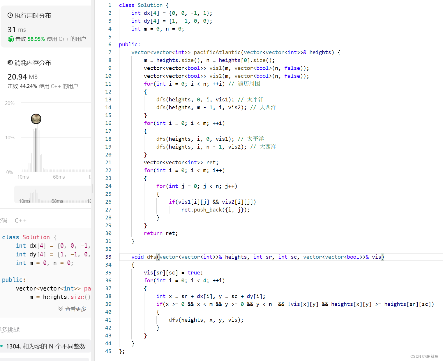 返回网格坐标 result 的 2D 列表 ,其中 result[i] = [ri, ci] 表示雨水从单元格 (ri, ci) 流动 既可流向太平洋也可流向大西洋 。