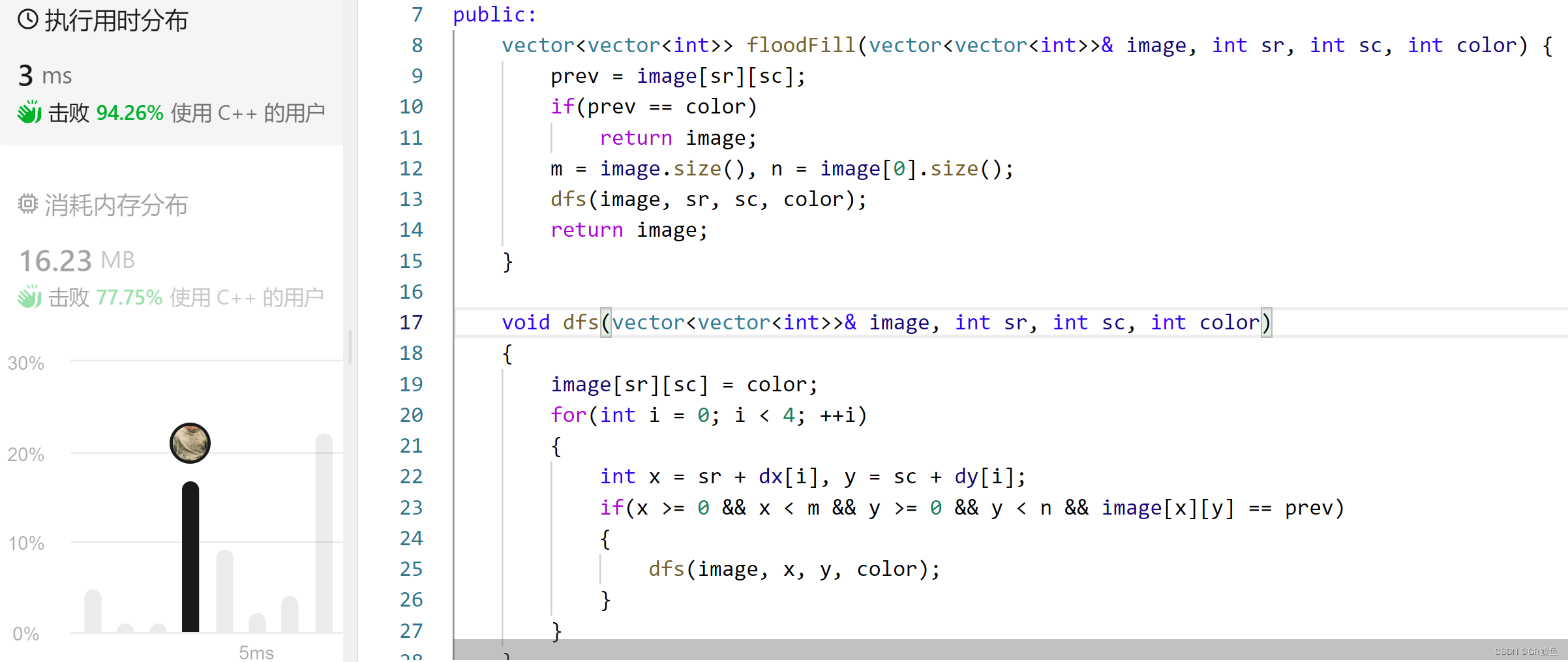 算法思路:利用深搜DFS或者宽搜BFS,遍历到与该点相连的所有像素相同的点,然后将其修改成指定的像素即可。宽搜BFS之前写过了,现在用深搜DFS写一遍: