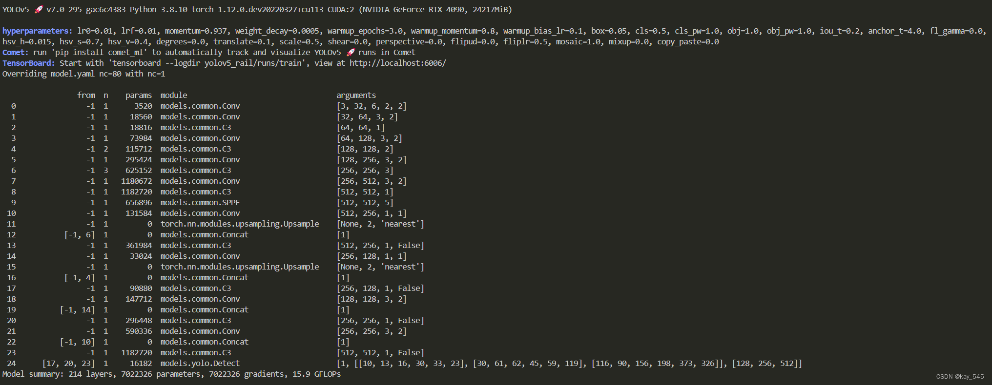 这个我是用自己的数据集进行训练,训练时,首先会打印一些模型的结构信心,还有一些参数设置,使用的哪张显卡等信息。