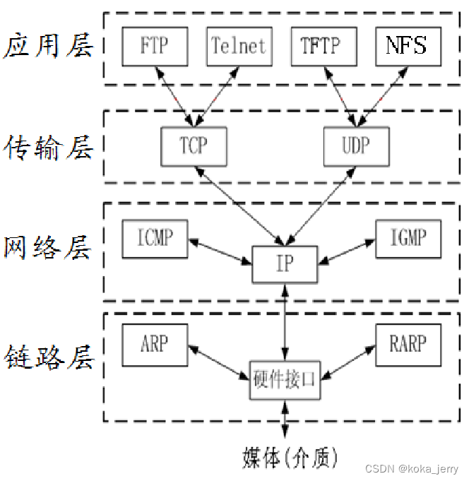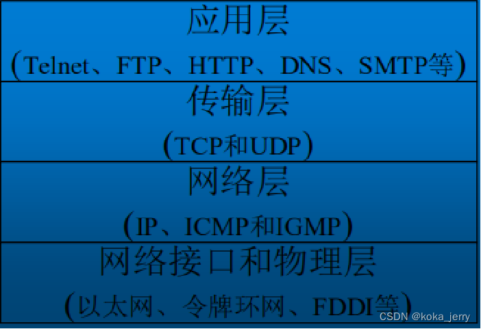 分为四层:应用层-----传输层-----网络层-----链路层(网络接口和物理层)