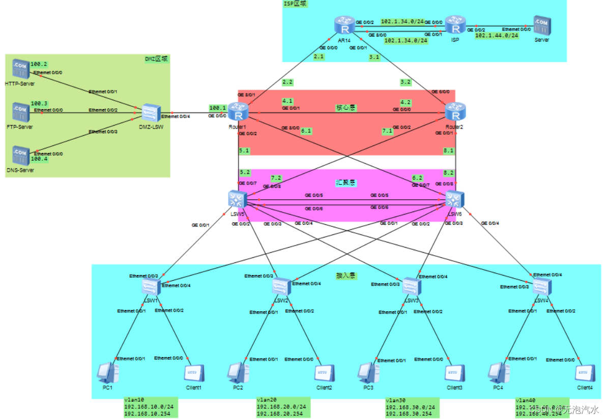 基于ensp的园区网络搭建综合实验 2024-06-06 网络, 运维 29人 已看 1、虚拟局域网(VLAN)2、链路聚合(E-trunk)3、多生成树协议(MSTP)4、VLANIF三层逻辑接口5、虚拟路由冗余协议(VRRP)6、开放式最短路径优先(OSPF)7、动态主机配置协议(DHCP)8、无线局域网集中式管理(AC+AP)9、防火墙安全策略(Firewall Security Policy)10、网络地址转换协议(NAT)1.防火墙配置存在问题,只能防火墙内部互联互通,外部与内部不能进行通信。2.无线设备DHCP可能只能获取到DNS,不能获得IP。