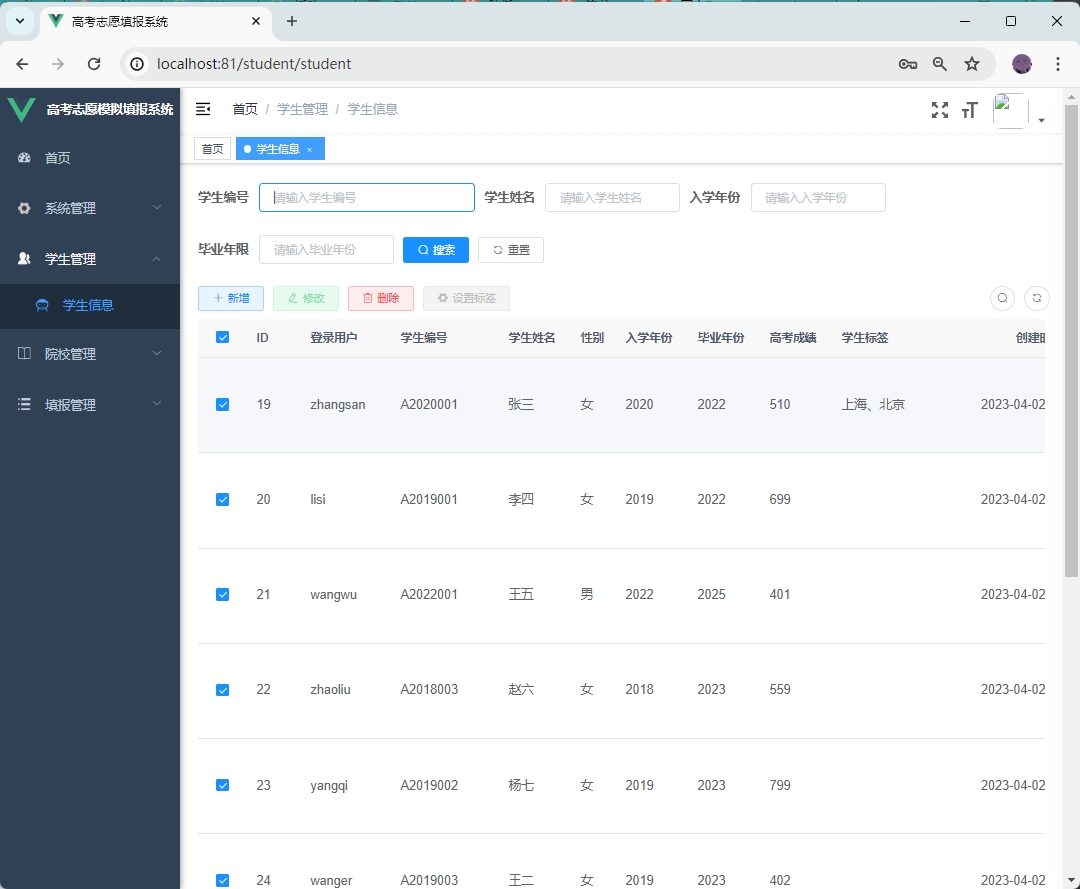 高考志愿系统-模拟填报模块分析 2024-05-15 高考 27人 已看 根据学生学号查询该学生的支援列表,然后拼接志愿的序号,也就是ProfessionSort属性,和各级志愿之间的分割。最后把学校和专业以及该学生的1,2,3志愿信息封装进一个1,2,3志愿视图对象。再选出该学生的1,2,3志愿信息,然后创建一个1,2,3志愿的视图实体类,最后重新根据学生id以及1,2,3志愿添加学生志愿以及1,2,3志愿详情。然后删除该1,2,3志愿对象中的1,2,3志愿详情以及学生志愿。接收一个1,2,3志愿的视图对象。3.志愿填报筛选院校以及专业。传参:studentNo,