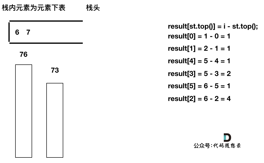 接下来用temperatures = [73, 74, 75, 71, 71, 72, 76, 73]为例来逐步分析,输出应该是 [1, 1, 4, 2, 1, 1, 0, 0]。
