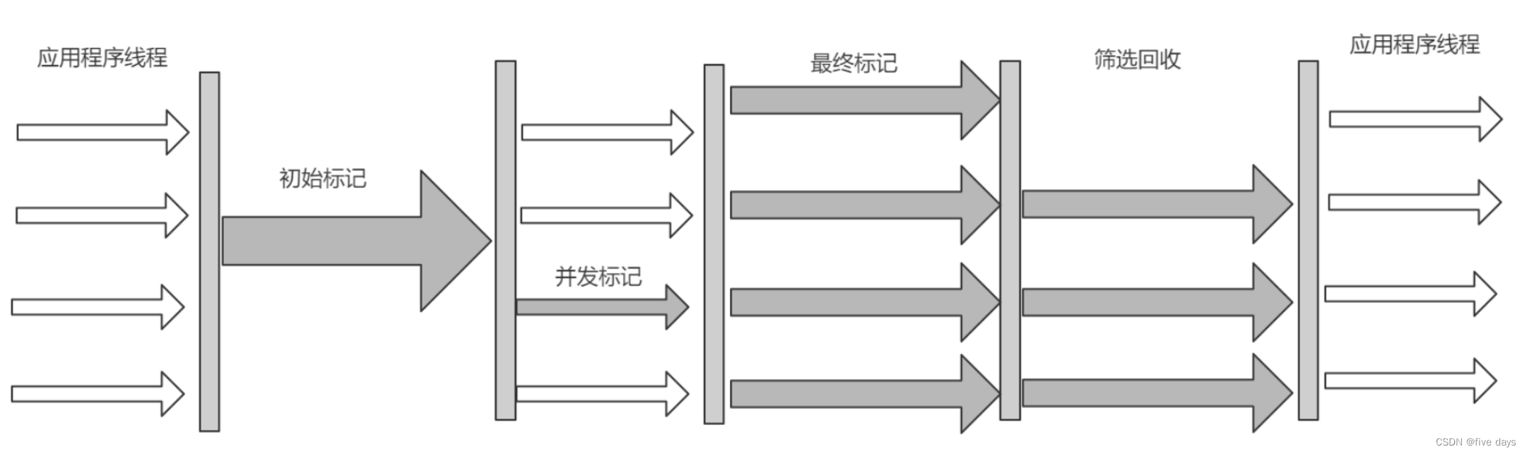 ( 1 ) 初始标记 CMS initial mark 标记 GC Roots 直接关联对象,不用 Tracing ,速度很快( 2 ) 并发标记 CMS concurrent mark 进行 GC Roots Tracing( 3 ) 重新标记 CMS remark 修改并发标记因用户程序变动的内容( 4 ) 并发清除 CMS concurrent sweep 清除不可达对象回收空间,同时有新垃圾产生,留着下次清理称为浮动垃圾