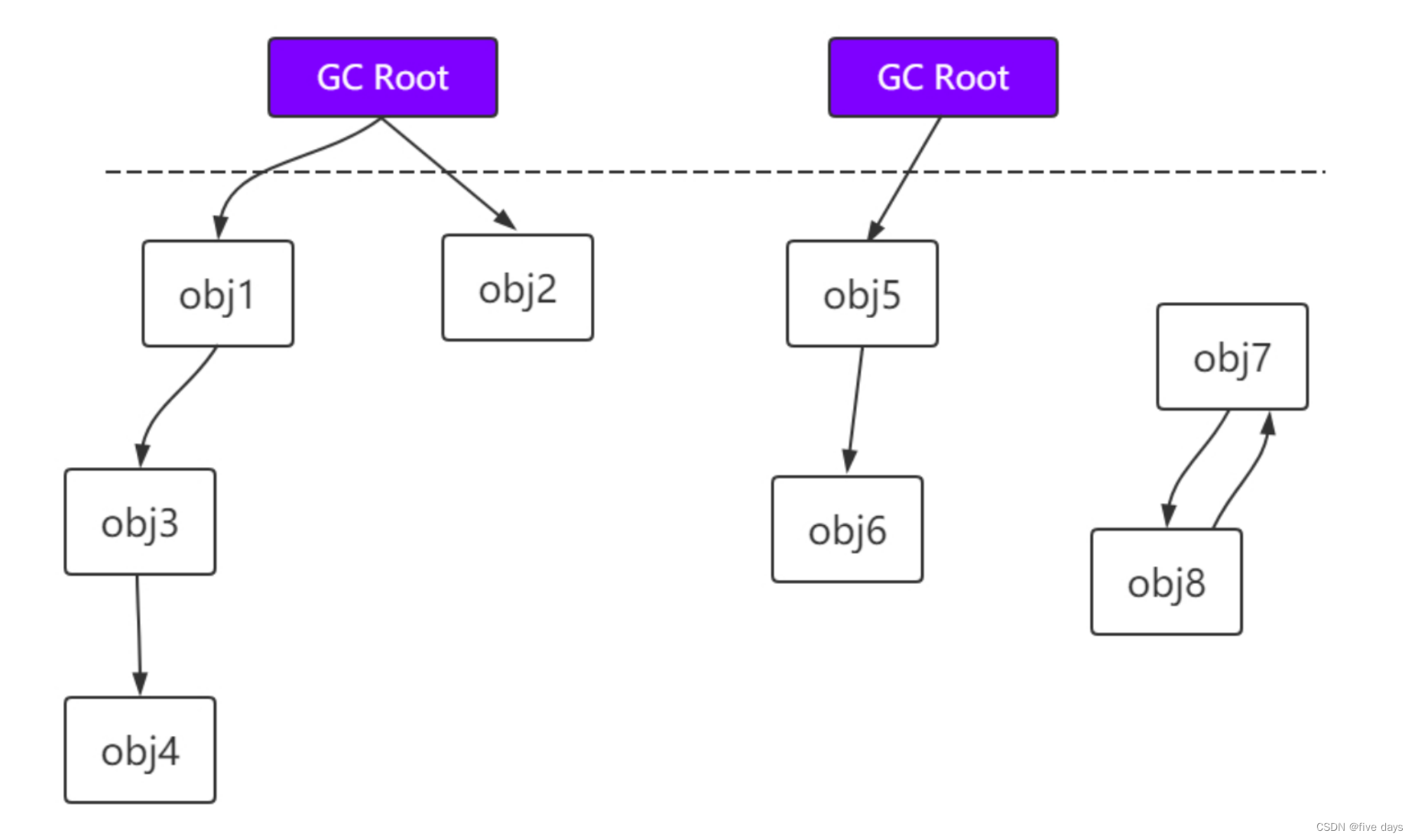 思考1:为什么要使用可达性分析?因为单靠引用的话,就可能存在obj7和obj8的互相引用的情况,然后没有任何线程使用到这两个对象了,所以它们其实是属于垃圾对象的。