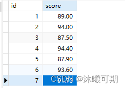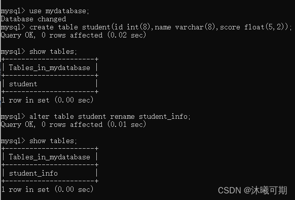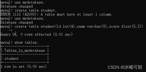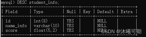 create table student(id int(4),name varchar(8),score float(5,2));