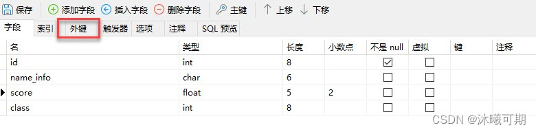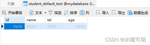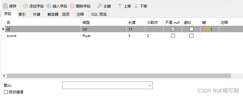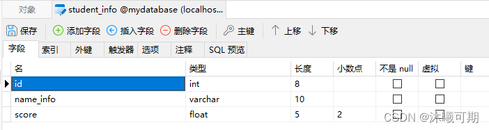 实操:在数据库mydatabase中新建一个名为student的表,表包含学号(id),姓名(name)和成绩信息(score)字段。