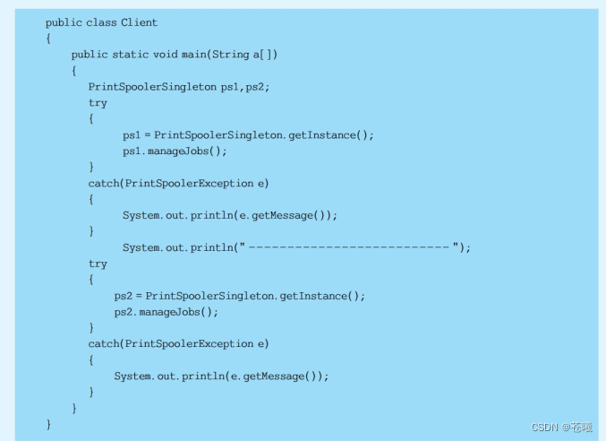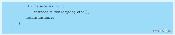 (3)滥用单例将带来一些负面问题,如为了节省资源将数据库连接池对象设计为单例类,可能会导致共享连接池对象的程序过多而出现连接池溢出;现在很多面向对象语言(如Java、C#)的运行环境都提供了自动垃圾回收的技术,因此,如果实例化的对象长时间不被利用,系统会认为它是垃圾,会自动销毁并回收资源,下次利用时又将重新实例化,这将导致对象状态的丢失。
