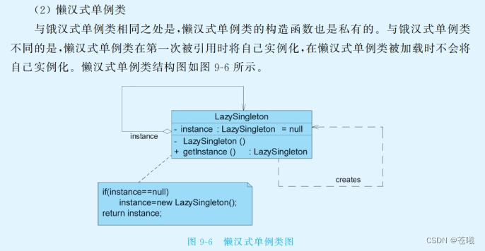 饿汉式单例类在自己被加载时就将自己实例化。单从资源利用效率角度来讲,这个比懒汉式单例类稍差些;从速度和反应时间角度来讲,则比懒汉式单例类稍好些。然而,懒汉式单例类在实例化时,必须处理好在多个线程同时首次引用此类时的访问限制问题,特别是当单例类作为资源控制器,在实例化时必然涉及资源初始化,而资源初始化很有可能耗费大量时间,这意味着多个线程同时首次引用此类的几率变得较大,需要通过同步化机制进行控制。