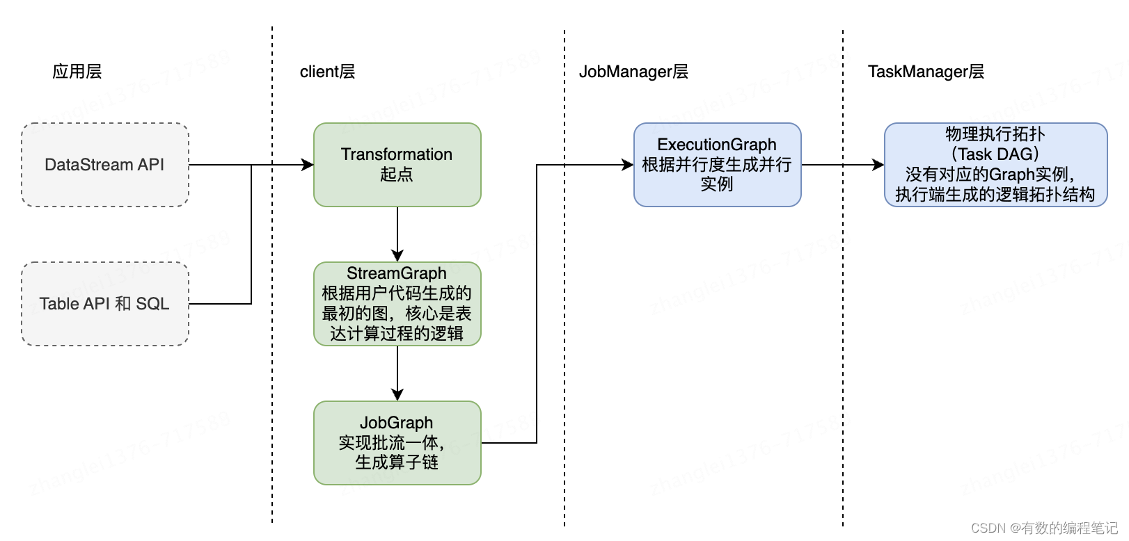 Flink任务如何跑起来之 1.DataStream和Transformation 2024-06-06 flink, 大数据 74人 已看 在使用Flink完成业务功能之余,有必要了解下我们的任务是如何跑起来的。知其然,知其所以然。既然重点是学习应用程序如何跑起来,那么应用程序的内容不重要,越简单越好。WordCount示例作为学习数据引擎时hello word程序,再合适不过。接下来便以任务执行顺序为线索开启对源码逐步学习。为了使示例代码足够纯粹(直接复制粘贴后即可跑起来的那种),因此在示例中直接使用List数据作为Source。最后,计划将自己学习的过程以系列文档的形式作为记录。